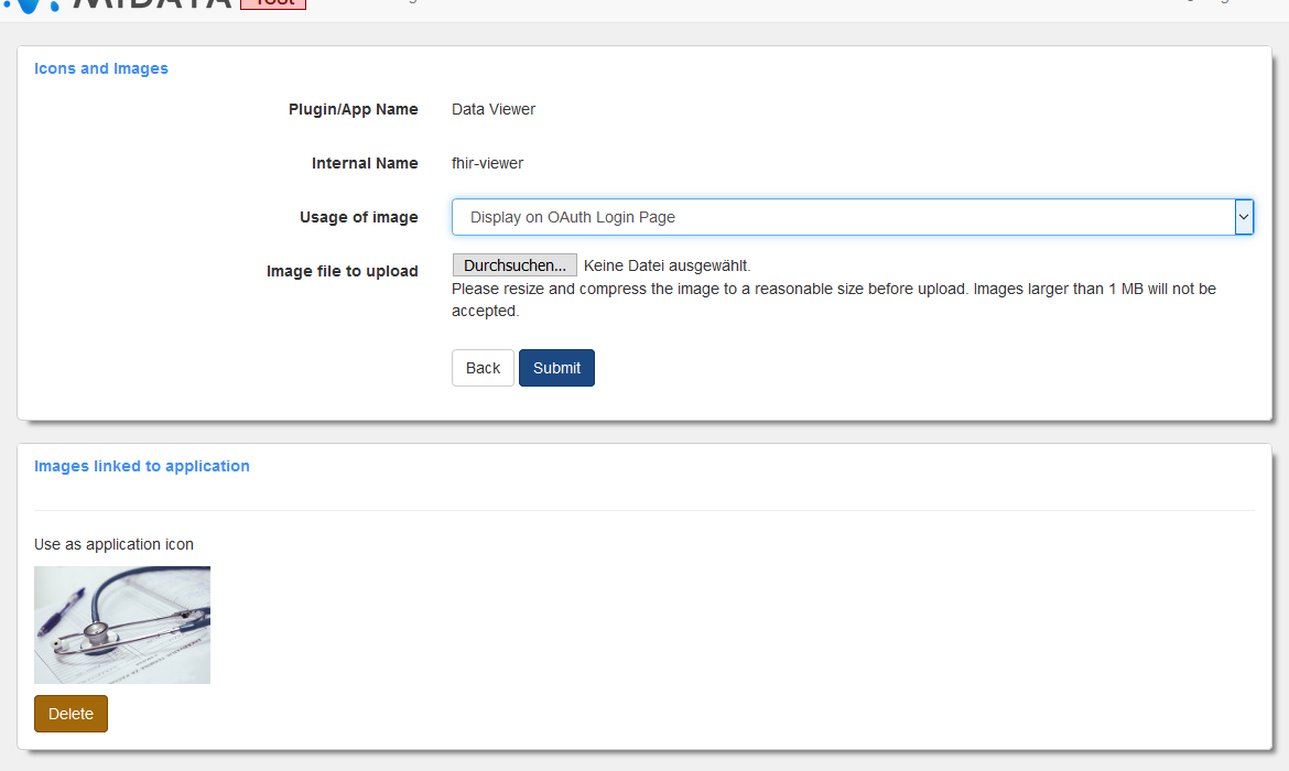You can upload application specific icons for your application to be used by MIDATA.